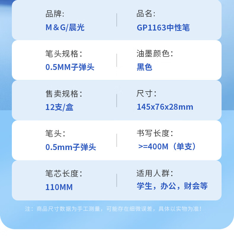 您的当前位置:首页>办公消耗用品及类似物品>文教用品>>晨光>晨光 中性笔 文具0.5mm黑色中性笔 子弹头笔 办公商用水笔 12支/盒GP1163