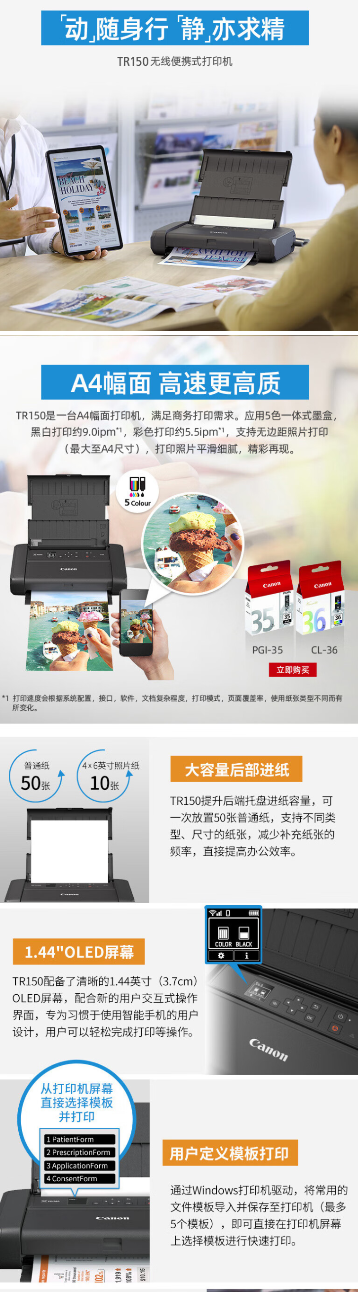 您的当前位置:首页>办公消耗用品及类似物品>办公设备>办公机器>佳能>佳能(Canon)TR150 无线彩色便携式打印机