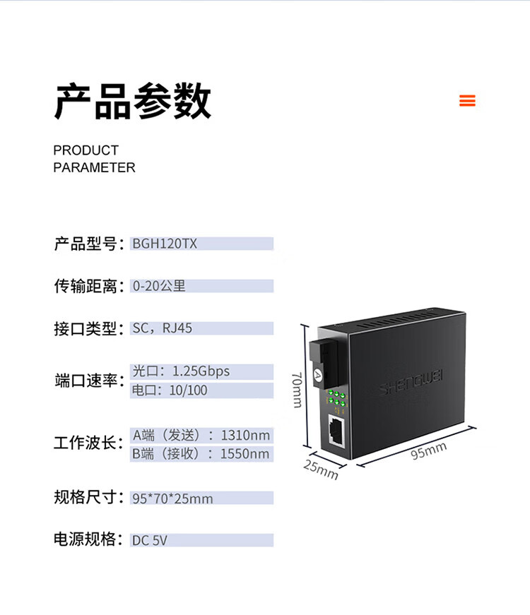 您的当前位置:首页>日用商品>电脑/网络设备及配件>其他网络设备>胜为>胜为 光纤收发器 百兆单模单纤光电转换器 SC接口20KM公里一对装 BGH120TX