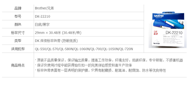 兄弟 DK-22210 白底黑字标签打印色带 29mm*30.48m