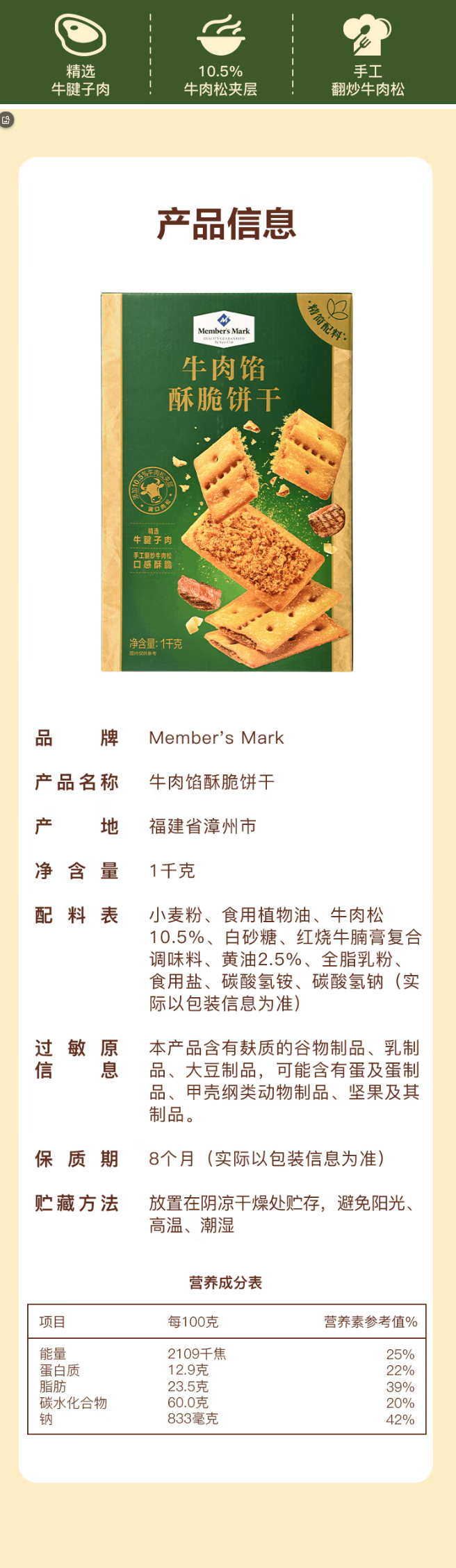 您的当前位置:首页>食品、饮料和烟草原料>包装食品类>零食>Member's Mark>牛肉馅酥脆饼干1kg