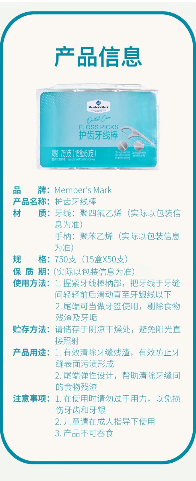 Members Mark 护齿牙线棒 750支(15盒*50支)
