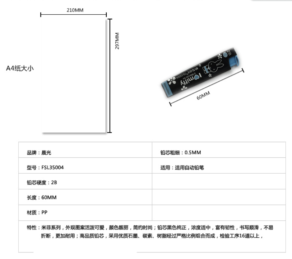 您的当前位置:首页>办公消耗用品及类似物品>文教用品>文具>晨光>晨光 2B米菲铅笔芯 FSL35004 0.5mm 单支装