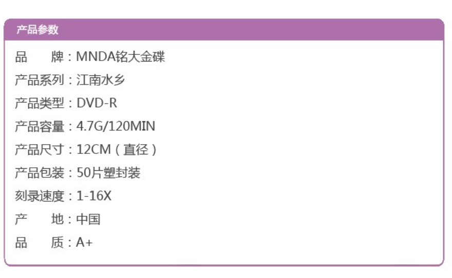 您的当前位置:首页>其它货物>定制类>其它物品>铭大金碟>铭大金碟 DVD-R光盘/刻录盘 江南水乡系列 16速4.7G 塑封装50片 空白光盘/默认
