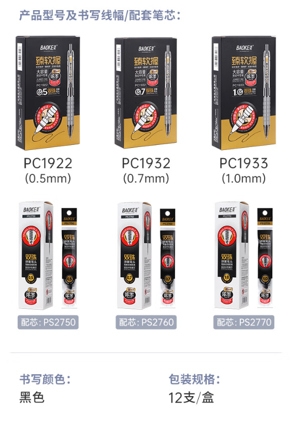 宝克 臻软握按动中性笔 黑色 12支/盒 PC1932